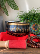 This brass singing bowl measures 12.5cm in diameter, decorated with black enamelling with script design to the outside and features a delightful mystical tree design within. Comes with a foam topped mallet, satin cushion and mala beads.