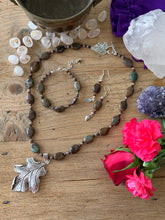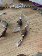 Snakeskin Jasper: Snakeskin Jasper and Czech glass beads in mutable greeny brown hues. This kind of reminded me of the moving from winter to spring, where the earth begins to be less stark and green starts to appear, or Autumn when the leaves begin to turn from the bright green hues to muted tones. An ideal gift for lovers of nature or those green witches in your life. Oval snakeskin Jasper beads accentuated with Czech glass bicones, earrings feature dainty Tibetan silver leaves, this too has a Tibetan silver leaf clasp.