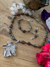 Each set is threaded on tiger tail to give a little strength, with a Tibetan silver oak leaf pendant measuring between 8cm-8.5cm including the nail. The findings are a mix of Tibetan silver and/or silver plated with the earring loops being 925 silver. Each necklace also features a Tibetan silver decorative leaf clasp, keeping with the theme. The bracelets are adjustable as they feature an extender, to allow for different sized wrists.